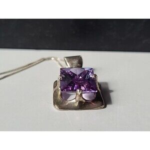 This is a vintage 925 sterling silver faceted purple glass rectangular shaped pendant necklace.