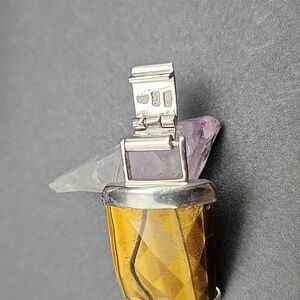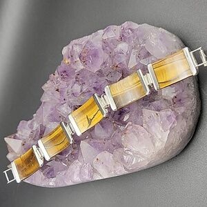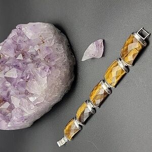 Up for your consideration is this rare .925 Sterling Silver and faceted long cut Tigers Eye, concaved panel bracelet. Silver is embellished on each end of the 5 panels along with the clasp. Silver test confirms metal is .925 as stamped on the snap clasp. Signature stamp unknown. Fits a 6.5" - 7" wrist comfortably.