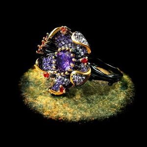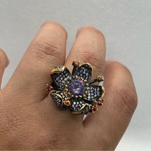 A stunning sterling silver ring shaped like a blooming flower, this piece showcases intricate craftsmanship with its unique design. Adorned with an amethyst-hued crystal at the center, the petals are elegantly encrusted with smaller cubic zirconia stones, adding sparkle to every angle. The delicate combination of black and gold plating further highlights the beauty of the floral design, creating a standout statement accessory. Perfect for those who love nature-inspired jewelry with a touch of sophistication.