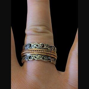 925 Sterling Silver Flower And Leaf 11.7mm Size 9 Two Tone Spinner Ring