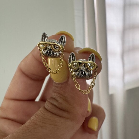 Adorable and fun French Bulldog stud earrings crafted in genuine 925 sterling silver. These unique earrings feature a detailed dog face design with gold-tone glasses and a chain accent, making them the perfect playful statement piece for any dog lover.