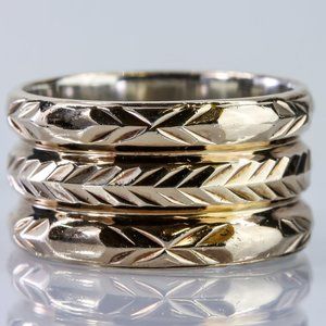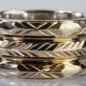 This unique ring features a gold platted sterling silver band with wheat patterns that give it a rustic and charming appeal. The wheat patterns are engraved with precision and detail, creating a contrast throughout the gold ring. The ring is size 8.25 and weighs 4.75dwt, making it a solid and durable piece of jewelry. This ring is a great choice for anyone who loves nature-inspired designs and vintage style. It is also a thoughtful gift idea for someone who values originality and craftsmanship.