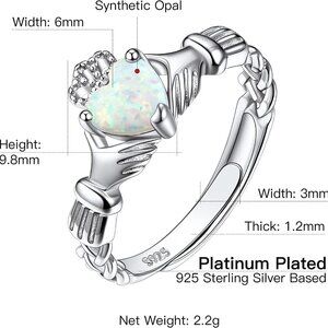 Product details Ring size Adjustable Material Platinum,Silver Metal type Claddagh Gem type Created Opal About this item STERLING SILVER: 925 sterlings silver claddagh heart ring, solid and durable, easily adjust to fit your ring size 4 to 12. Ring size: width/3mm, thickness/1.2mm, heigh of he