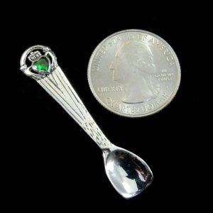 Solid Sterling Silver Irish/Celtic Claddagh Salt Spoon w/ Green Crystal Heart