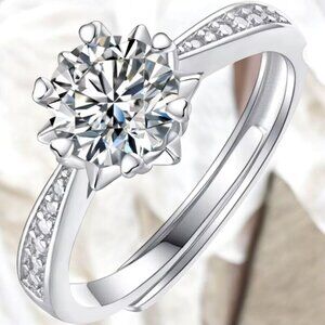 This 1 carat moissanite ring features a round cut stone with VVS clarity, set in 925 sterling silver with 18k white gold plating. The adjustable opening fits most sizes. It has a prong setting with side accents. Includes a GRA certificate with a lifetime warranty. Comes in gift-ready packaging.