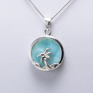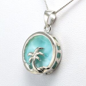 This vintage coconut tree pendant necklace is made with 100% natural genuine rare Larimar stone from Dominican Republic and solid 925 sterling silver w/ Rhodium gold plating for better quality and prolonged shine!
