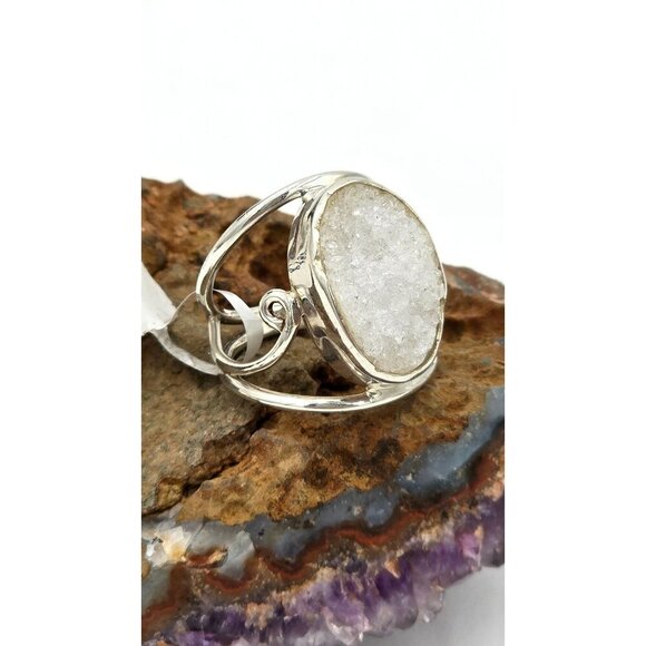 925 Sterling Silver Natural White Druzy Quartz Crystal Ring Size 7 Fine Jewelry