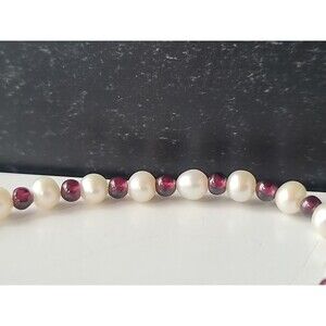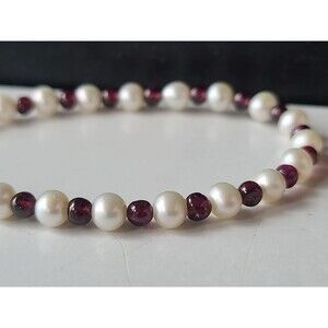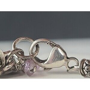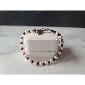 This is a vintage 925 sterling silver pearl and garnet beaded bracelet with a closure that has heart and circle charm and amethyst beads.
