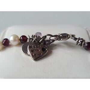 925 Sterling Silver Pearl & Garnet Beaded Bracelet With Heart & Amethyst Charms