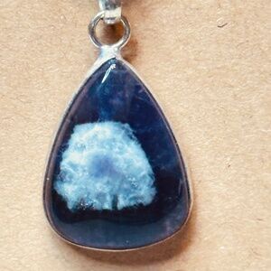 925 Sterling Silver Plated & Amethyst Crystal pear cut pendant. Has large feathering design on front in similar shape as stone. EUC