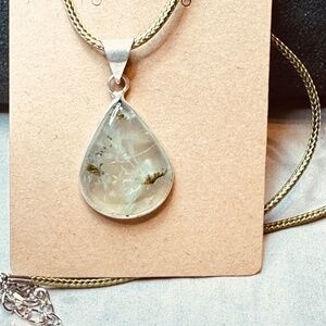 925 Sterling Silver Plated genuine, pear shaped, Prehnite Crystal stone. Stone is beautiful pale green w/darker green areas & feather-like inclusions. Crystals are all unique whereas they have their own inclusions which are comparable to our fingerprints, none are ever identical. EUC