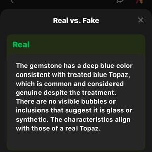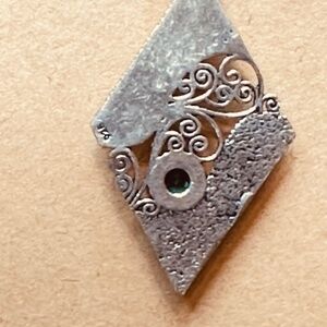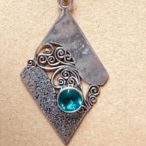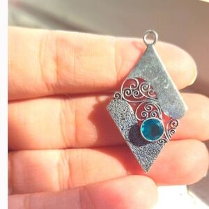 925 Sterling Silver Plated, genuine, round bezel set Blue Topaz. Kite setting w/curly cues diagonally through center, above is smooth below is textured. I added bail, I’m guessing this is NWOT. Cord is for display purposes, let me know if you would like to keep it.