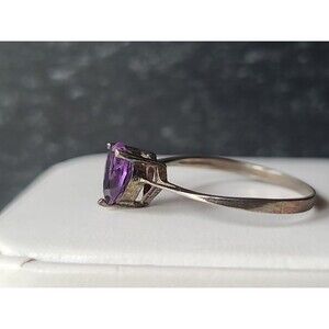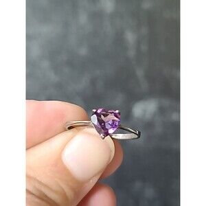 This is a vintage 925 sterling silver prong set amethyst heart-shaped solitaire ring.