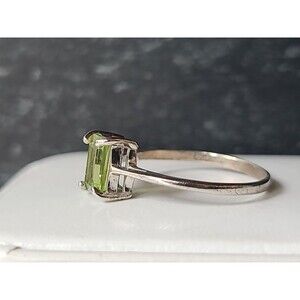 This is a vintage 925 sterling silver prong set peridot rectangular shaped solitaire ring.