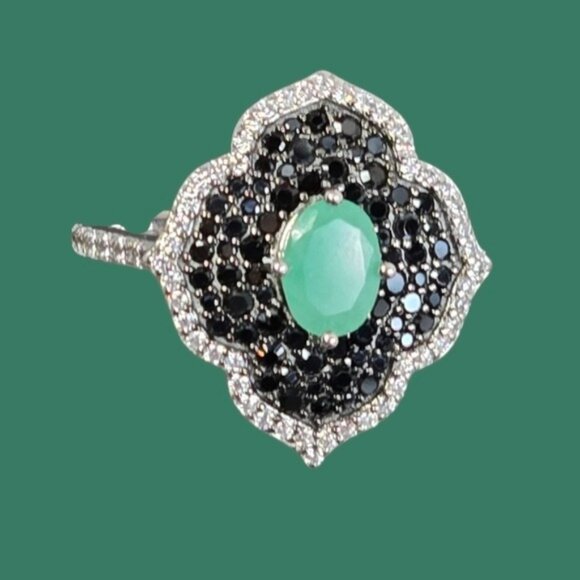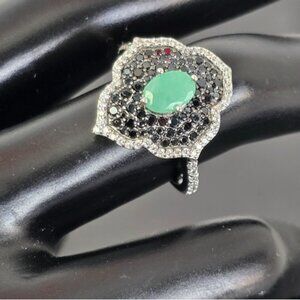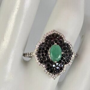 925 Sterling Silver Ring Sz 8 with Natural Emerald 5x7mm & Blk Spinel Gems