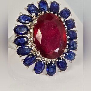 925 Sterling Silver Ring wirh Natural Ruby 10X14mm & Blue Sapphire Gems