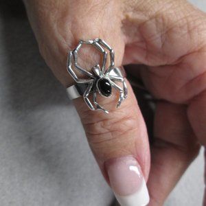 Creepy crawly solid 925 sterling silver ARACHNID ring. Very cool spider looks like it's crawling up your hand! Nice design and great detail. The black onyx stone on the body is pure perfection! Measures 1" long. Heavier weight ring. Stamped 925.
