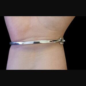 Add a touch of elegance to your outfit with this stunning 925 sterling silver bangle bracelet. The bracelet features a square cut design with a hinged clasp, making it easy to wear and adjust to your desired fit. The black color of the bracelet adds a sleek and sophisticated look that will complement any outfit. Crafted with high-quality materials, this bracelet is durable and long-lasting. The unknown main stone creation, secondary stone, and base metal add to the mystery and allure of this piece. This bracelet is perfect for any occasion and makes a great addition to any jewelry collection.