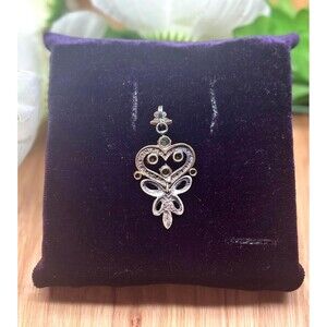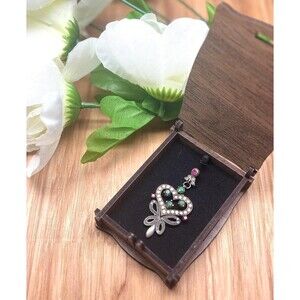 The leaf-shaped clasp sparkles with four white quartz stones, topped with a round ruby for a regal finish. Two additional rubies embellish the outer heart edges, adding vibrant contrast. From the bottom dangles a delicately crafted silver bow, completing this vintage-inspired design with charm and movement.