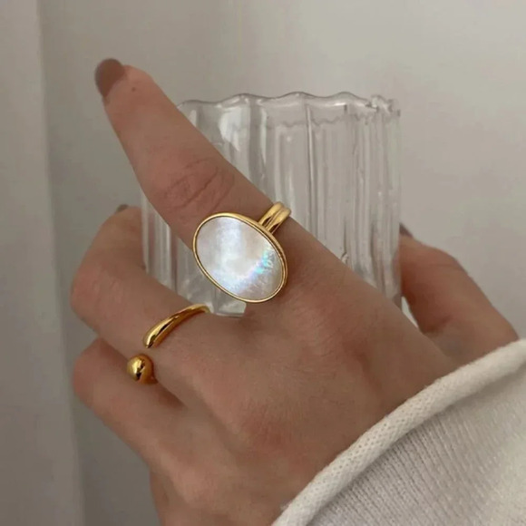 925 Sterling Silver White Mother of Pearl Vintage Gold Oval Statement Ring