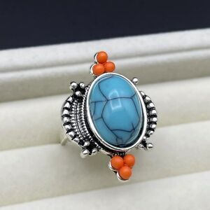 S925 Sterling Silver Plated with Turquoise and Orange Enamel Bohemian Style Statement Ring