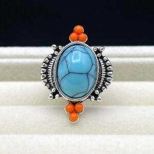 925 Sterling Silver with Turquoise and Enamel Boho Statement Ring Size 8