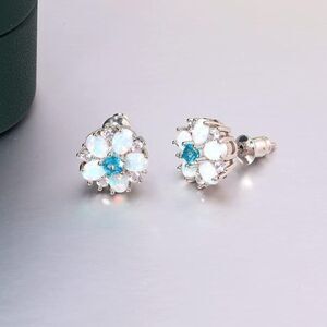 .925 Sterling Silver with White Fire Opal and Aquamarine Flower Stud Earrings