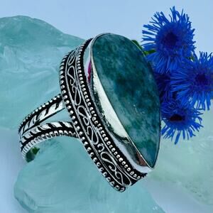 925 Sterling Teardrop Moss Agate Ring Size 8.5