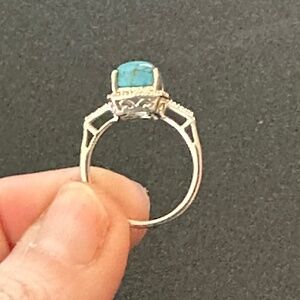 NWOT – Solid 925 Sterling silver ring w/Mojave blue Turquoise stone. Solitaire ring made w/assembled Mojave Turquoise. Stone is rectangular & sits up a little high. Prong set. Fancy metal work. Beautiful undercarriage.