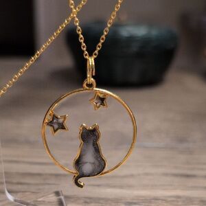 925 Sterling Silver Gold Plated Cat and Stars Round Pendant Necklace. The round pendant is made of resin with an adorable cat looking up at 2 stars in the sky and the chain is gold plated over 925 sterling silver.