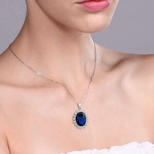 Brand New - 925 Sterling Silver with Oval Cut Created Blue Sapphire and White Diamond Cubic Zirconia CZ Pendant Necklace