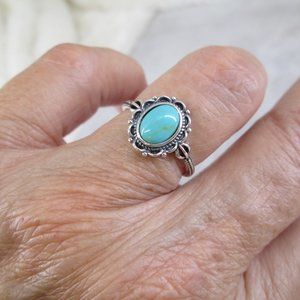 925 sterling silver ring with a beautiful oval genuine turquoise stone. Nicely designed setting. Face height = 12mm. Stamped 925.