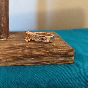 925 Two Toned Filigree Rose/Silver Metal Champagne Color Stone Ring Sz 5.5. This is sterling in a rose and silver metal finish. The large center stone is a champagne color but tests as glass. It really sparkles! There are little clear stones on the band. A lot of detail on this ring. Pre-owned, it is in excellent condition.