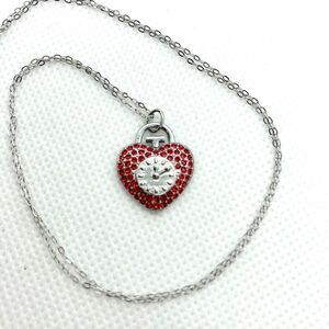 Sterling Silver Wizard of Oz themed necklace. The heart has an analog clock reading 12:10, and is covered in tiny red CZ gems. The charm is free-floating on the s925 dainty chain necklace. 925 is engraved on the top of the back of the "T" of the heart and on the closure. The silver link that connects the charms to the necklace have been soldered shut. Spring ring clasp closure.