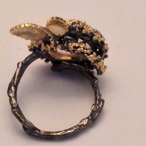 Price ⬇️Amazing 💍 ring, artistically & originally Hand made. It has a beautiful, smooth, oval Rose 🌹quartz stone, that measures 12 x 14 mm. Made of 925 sterling silver, with black rhodium & 14 k yellow gold overlay enhancements. TBW of 49.35 ct. & sized @ 9.75. Beautiful 💞 piece of art! NWOT