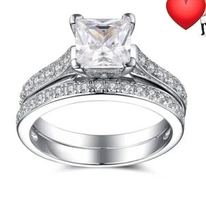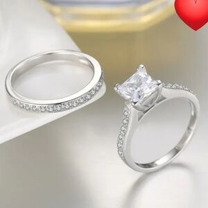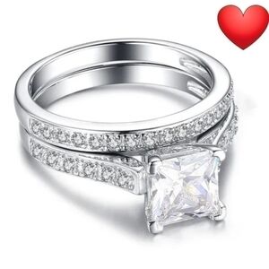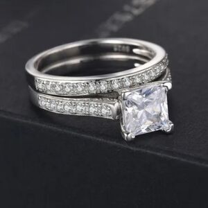 Fashion Jewelry Collection 925 Silver Square Princess Center Accented Round 7 CZ Stones on each side Wedding Band and Engagement Ring Set