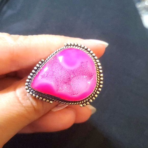 gorgeous pink agate with stunning sugar. size 6.5 and beautiful. 925 stamped sterling silver overlay.