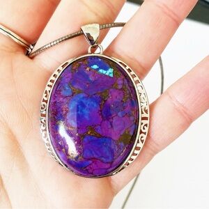 925 sterling silver Mojave purple turquoise pendant on 18” sterling chain. Stunning purple turquoise stone!! Large oval shape set in a sterling silver filigree bezel. Marked 925 on back. On a 925 Italy smooth snake chain- 18” long. Gorgeous necklace in excellent condition!