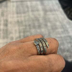 This stunning multi-band ring features elegant blue and gold accents, perfect for adding a touch of sophistication to any outfit. Its unique design makes it a standout piece in any jewelry collection.