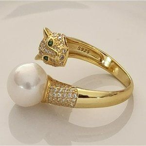 NEW 925S Genuine 10 mm Freshwater Pearl Adjustable Gold Ring With Leopard Design