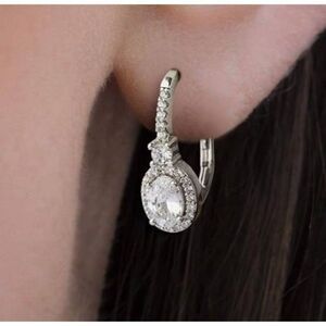 Rhodium plated sterling silver oval and round cut halo design simulated diamond leverback earrings. 1.5" in length with a total of 3 carats gem weight.