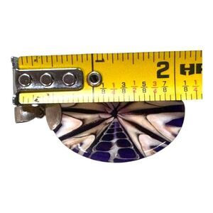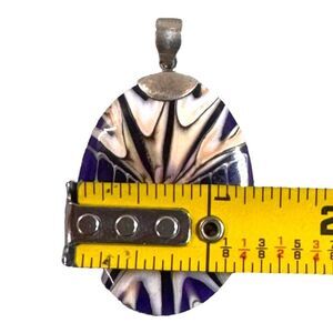This pendant features a unique abstract design with rich purple and cream tones, set in an oval shape. A sterling bail offers secure wearability.