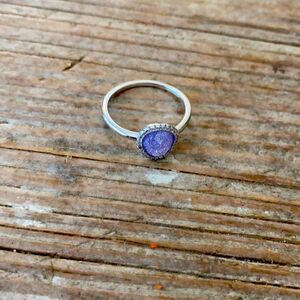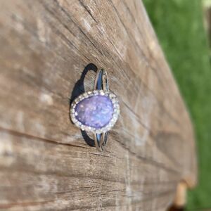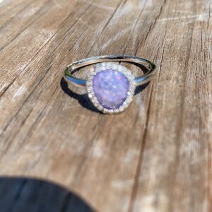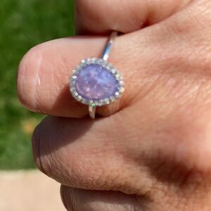 This gorgeous ring is a lavender glitter stone surrounded with cubic zirconia. 100%Sterling silver