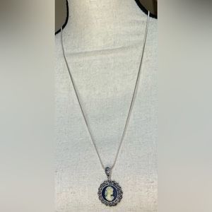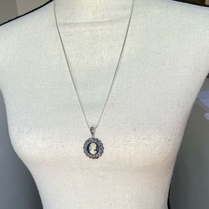 Victorian appearance pendant with off white cameo and blue background surrounded by marcasite set in sterling silver.