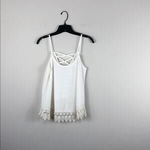 9.3 Eline by Line and Dot crochet white tank top. Lined. Criss criss back detail. Self 95% polyester, 5% spandex. New without tags.