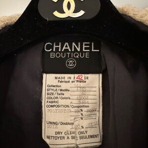 This chic, vintage, never worn CHANEL sequined suit with off white lace collar is in near perfect condition! There are very subtle pulls in the silk crepe lining around the hem of the jacket as there are sequins around the waist of the skirt. This ensemble is a bold runway piece Fall/Winter 1994. The suit size is a 42 French which is about size 8~10 US, women’s. The V-neckline of the jacket is trimmed with a lace collar. Definitely a fashion statement. Seriously inquiries only as the item is un returnable/non-refundable.