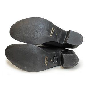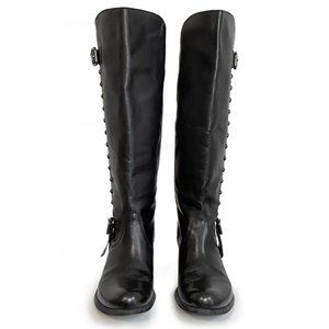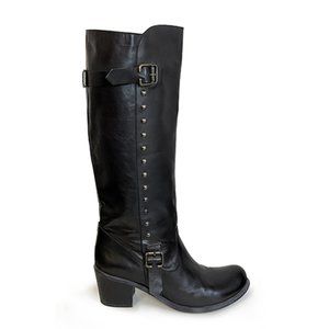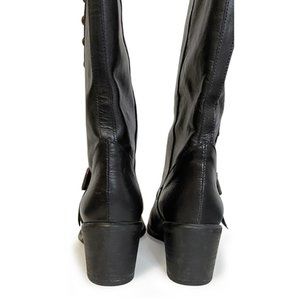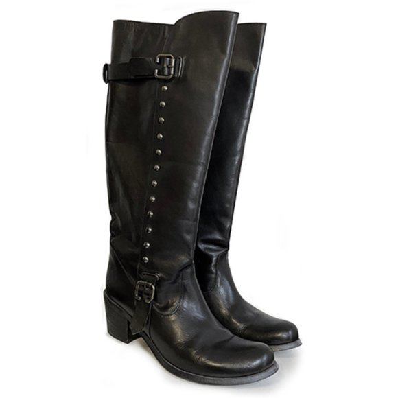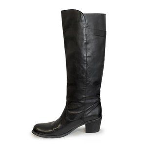 Knee high black leather boots with a fun motorcycle-meets-cowboy vibe. A bold surprise under a demure prairie dress? Paired with this season's hottest mini and black tights? Worn only three times, these EU 40 boots feel more like a US 9.75 and better suited for a narrow 10, or average 9.5. Made in Italy. Gorgeous leather in and out. 2.5" stacked heel made of something, 15" shaft, 15" calf. No tags except that sticker I left on the bottom. :)