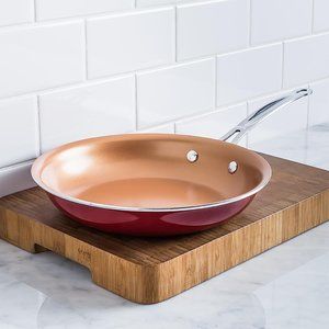 Who knew cooking with copper implements would be good for the family? We did! This Red Copper Non-Stick Frying Pan offers the ease of non-stick and the copper conducts heat quickly and efficiently so you can cook items faster than before. The stunning look of copper will also add an element of style to your kitchen. Get cooking with copper.
