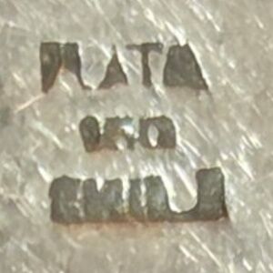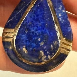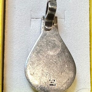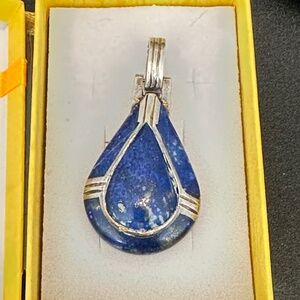 950 Silver. Vintage, Genuine Lapis Lazuli Pendant Enhancer. Pear shaped Lapis center w/3 Lapis stones around separated w/inlaid silver. Enhancer, bail that opens (instead of slides) to put on various types of chains/ropes/beads. Stamp/signature on back “PLATA 950 EMIL ?”. PLATA is Spanish for Silver. 950 is 95% pure Silver (higher than 92.5 Sterling Silver). EMIL (unsure of last letter) more than likely Artist’s name. Shows wear. Chain NOT included.