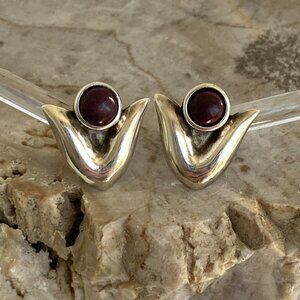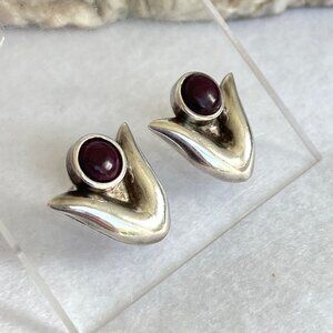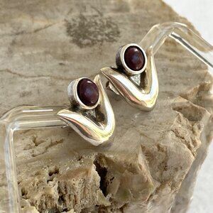 950 Sterling Silver Modernist Floral Round Bezel Set Garnet Cabochon Stud Earrings Post Back